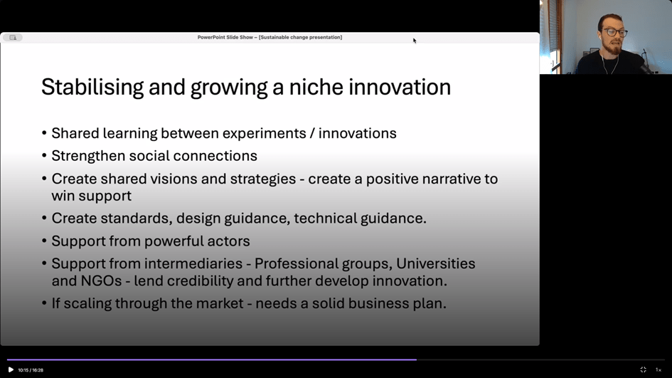 It’s about how you stabilise and grow a niche innovation, which apart from technical innovation needs to “disrupt the regime” at the “landscape level” for the industry it’s operating in. Listen in, I think you will find it positive and provocative.