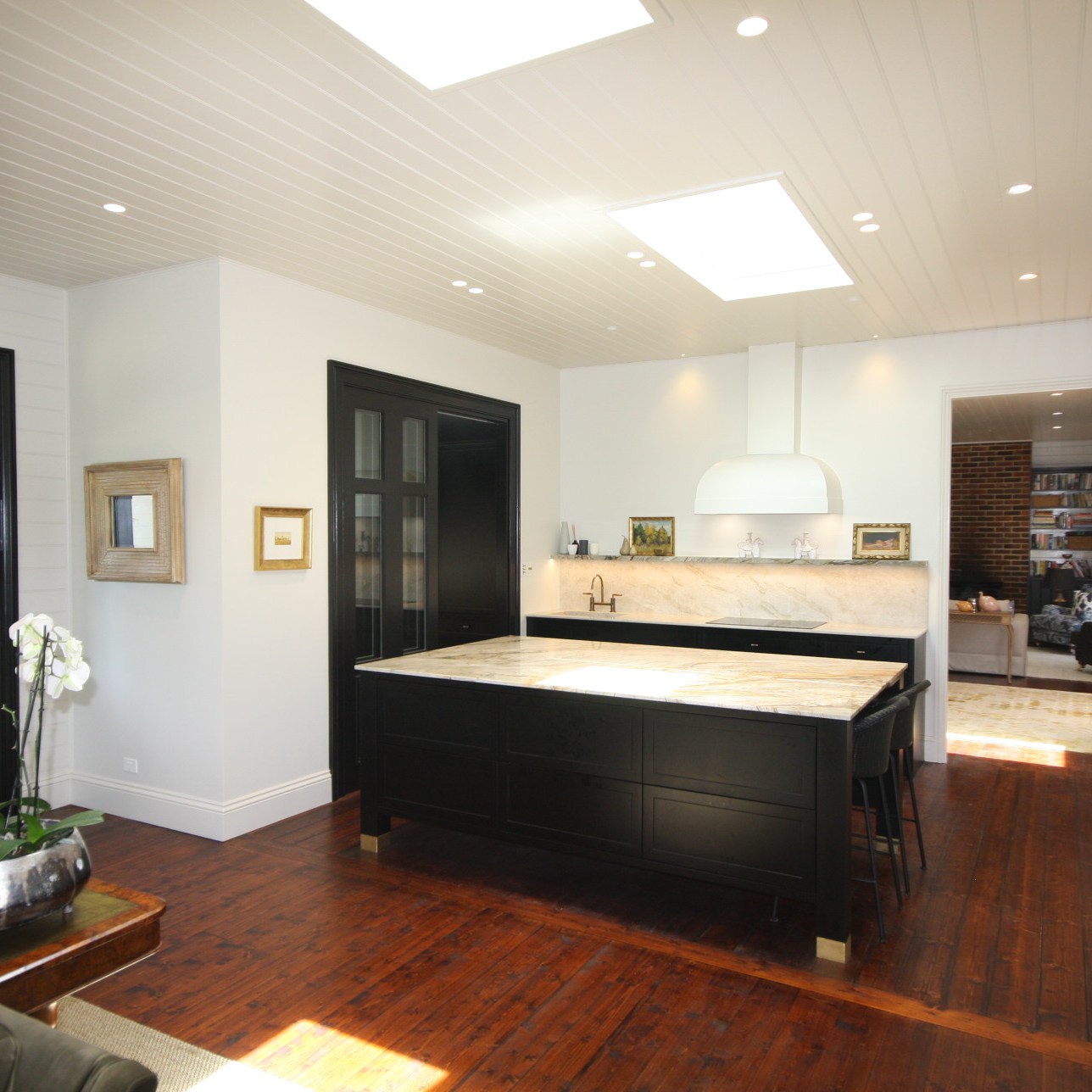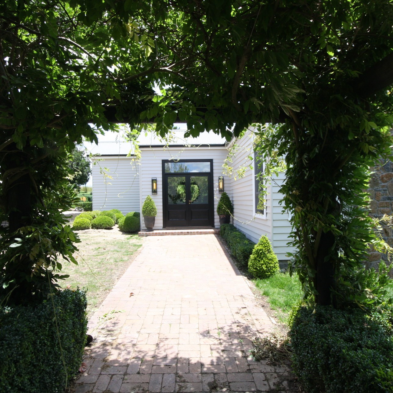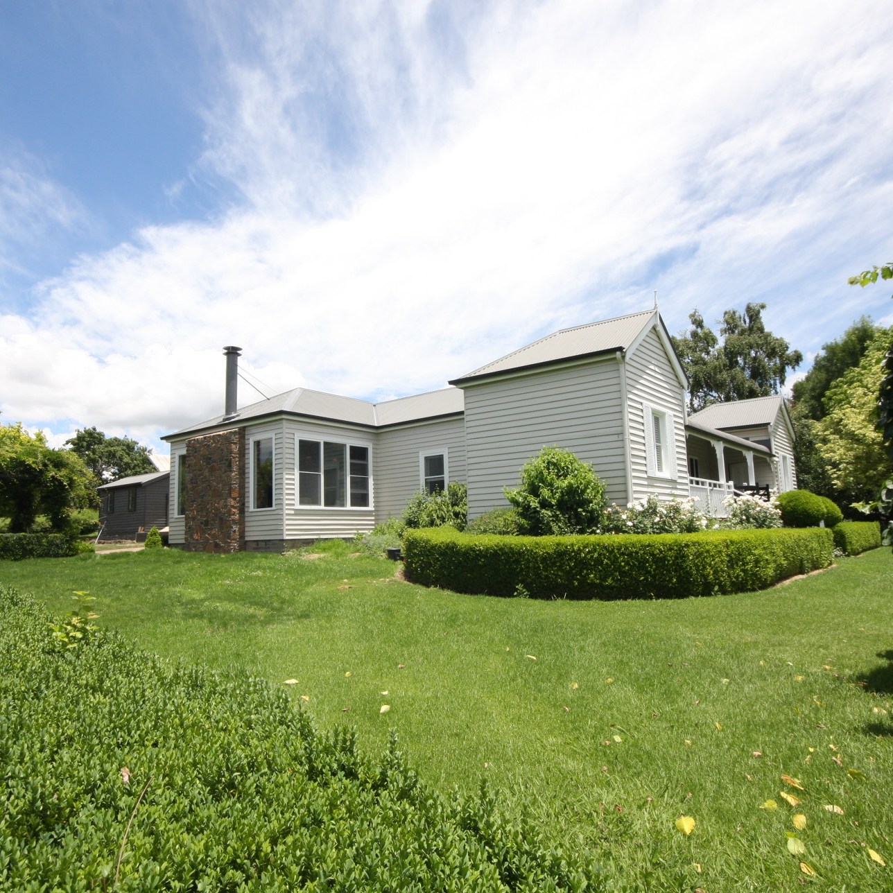 This Federation-era farmhouse had suffered from the usual ad-hoc additions and the clients wanted to make it function better for modern life as well as fit with their sharp sense of design. The main living space was reworked and extended, with large east-facing windows, a massive stone fireplace, and a stunning marble-topped island in the open-kitchen. Through a glazed screen to the side is a generous back-kitchen where the serious cooking is done. An office, laundry and bathroom open from a new back hall, with an access path direct from the garage. The 1950s laundry block was craned into a new location for guest accommodation. To complete the transformation we added a new formal entry, located where the alignments of the original front hall and the modern vine-covered pergola intersect.