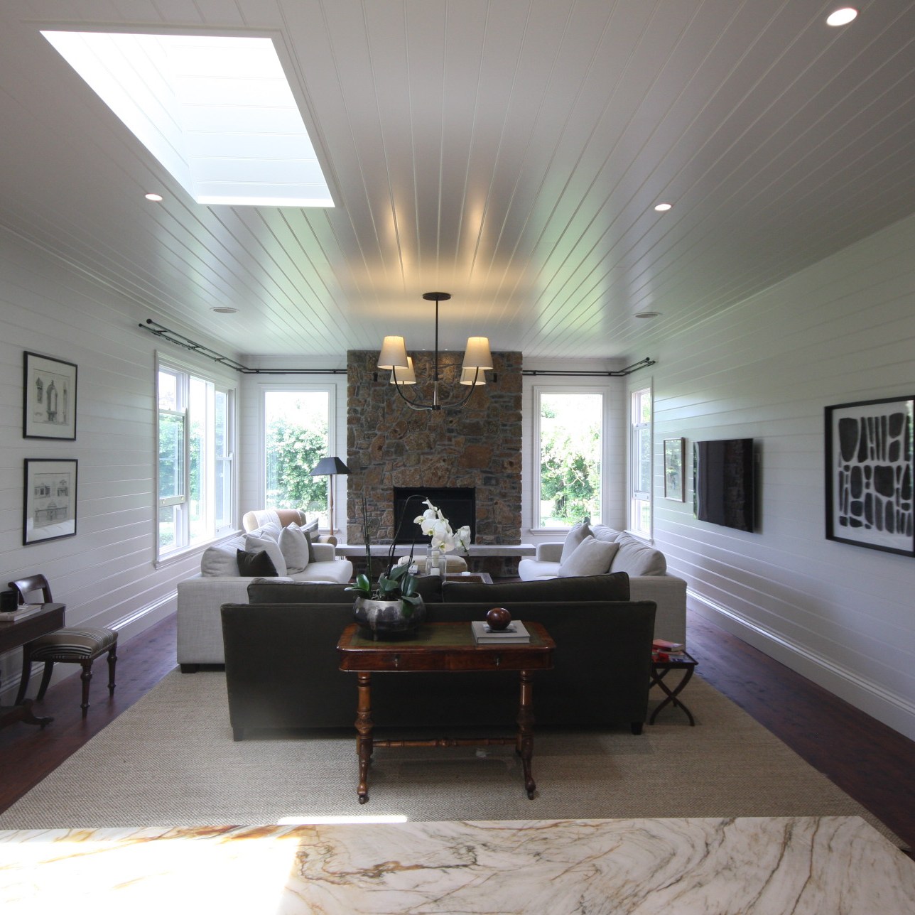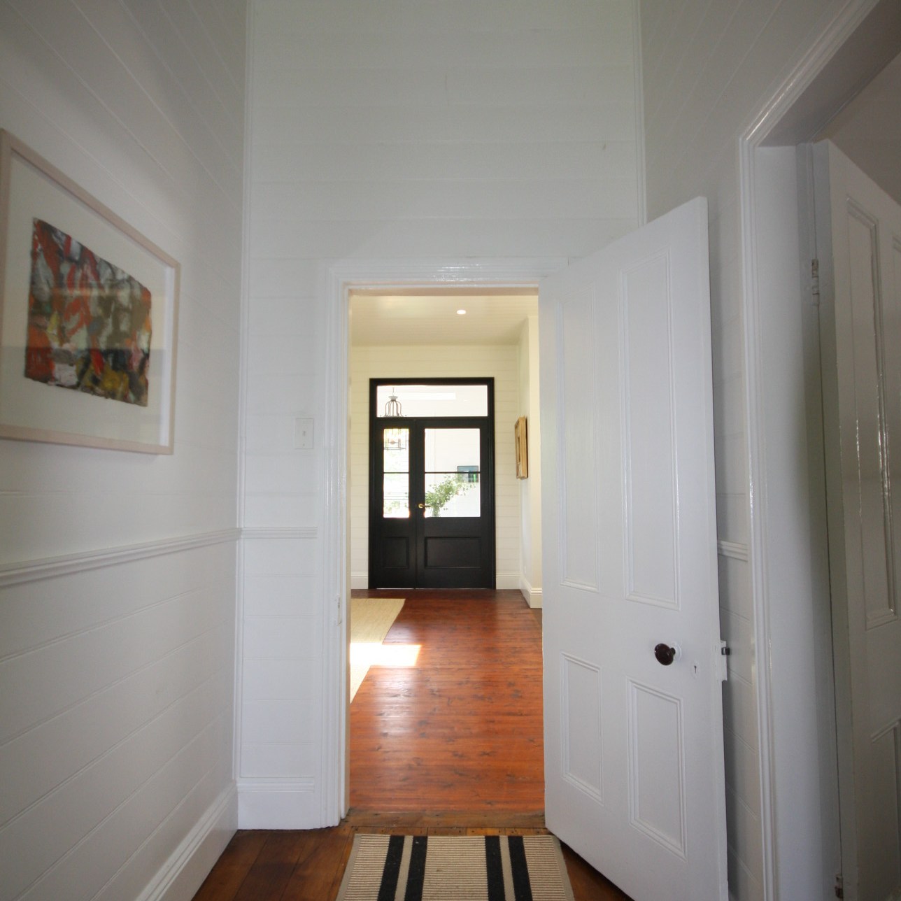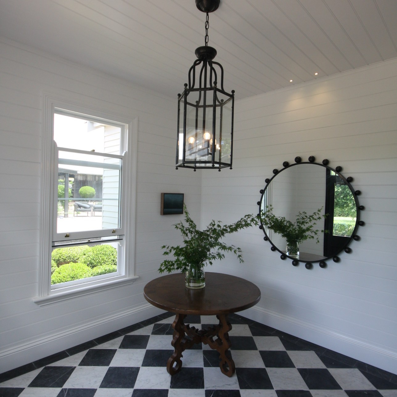 This Federation-era farmhouse had suffered from the usual ad-hoc additions and the clients wanted to make it function better for modern life as well as fit with their sharp sense of design. The main living space was reworked and extended, with large east-facing windows, a massive stone fireplace, and a stunning marble-topped island in the open-kitchen. Through a glazed screen to the side is a generous back-kitchen where the serious cooking is done. An office, laundry and bathroom open from a new back hall, with an access path direct from the garage. The 1950s laundry block was craned into a new location for guest accommodation. To complete the transformation we added a new formal entry, located where the alignments of the original front hall and the modern vine-covered pergola intersect.