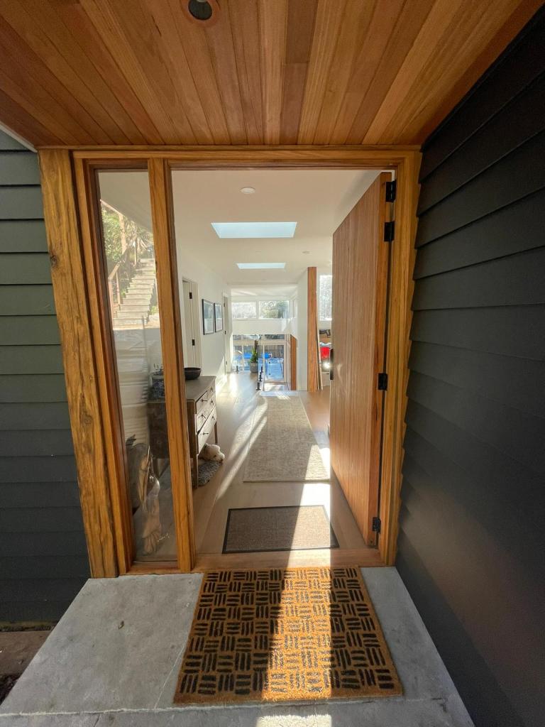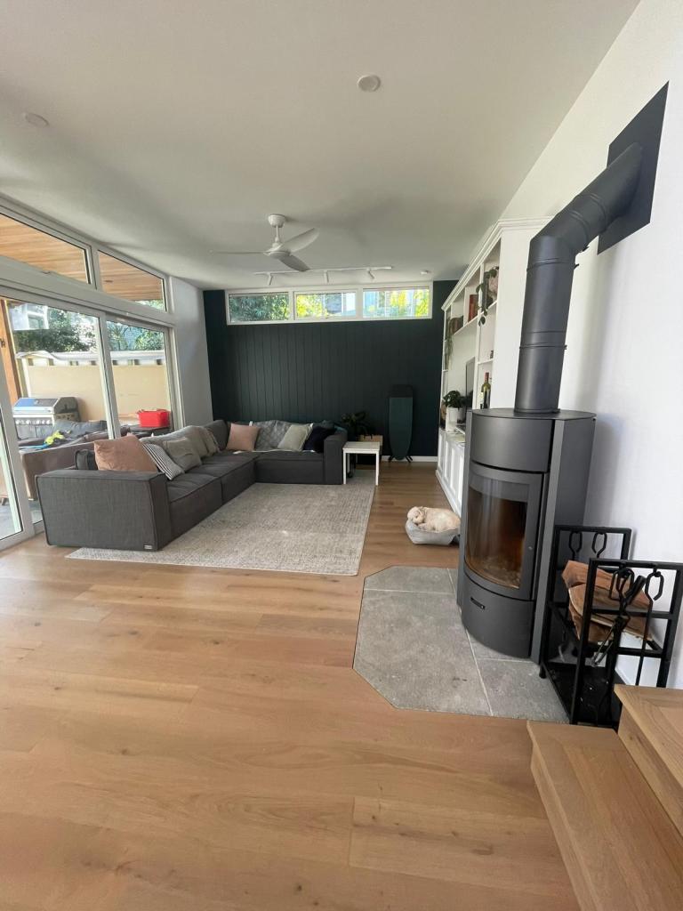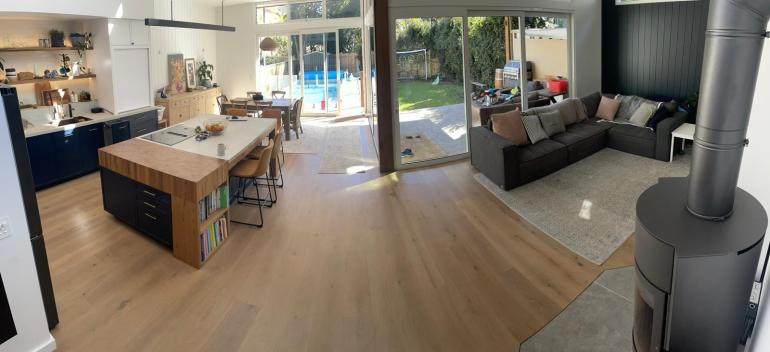 The existing house was well past its ‘use by date’ with an awkward layout, little connection to the garden, no outlook and poor access from the street, so demolition would have been first choice for many. But the owners were committed to making all aspects of their homelife as sustainable as possible, and that started with retention of the existing structure to preserve its embodied carbon. They also wanted to manage the construction process themselves, doing the work in stages as finance and family needs dictated, so it was critical the house remained habitable at (almost) all times. A masterplan was developed of which only the first phase has been completed to date. This involved lowering the floor level of the open-plan living/dining/kitchen space at the back to improve access to the garden, including a large covered deck and new swimming pool. The original ceiling level was maintained over the kitchen area to visually connect the spaces, creating a ‘turret’ with high level windows on three sides for daylight, ventilation and outlook. The bedrooms and bathrooms in the front section were reconfigured, whilst some basement space was opened up for a playroom and study. Provision has been made for the future addition of a full second storey, with a flexible layout that could function as a parents retreat, granny flat, or home office depending on need at the time, and this would open direct from the raised street level for better access. Energy efficiency was improved by insulating the external walls and installing double-glazed windows, solar PV panels and a wood stove. Recycled timber posts, a ‘green roof’ terrace and rainwater tanks complete the sustainable features.